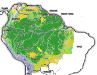 The Amazon River Basin is home to the largest rainforest on Earth. The basin -- roughly the size of the forty-eight contiguous United States -- covers some 40% of the South American continent and includes parts of eight South American countries: Brazil, Bolivia, Peru, Ecuador, Colombia, Venezuela, Guyana, and Suriname.